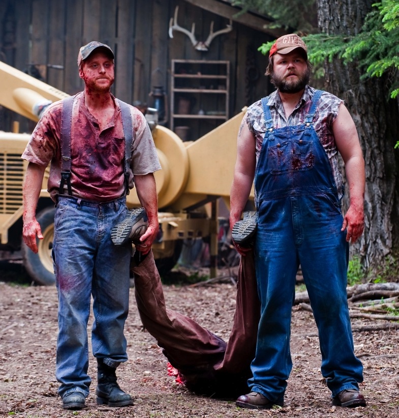 As they are driving, they almost collide with a beat up old pickup truck. As the truck passes them, the occupants stare at the college kids ominously. foreshadowing of the cruel plans they have for these kids? It turns out… not really. Tucker (played by Alan Tudyk) and Dale (Tyler Labine) are on their way to Tucker’s newly purchased vacation home for some relaxing and fishing. The kids run into the duo at a gas station, where we discover that Dale is painfully shy. Tucker tries to give him a pep talk (“You are a good looking man, in a way”) to go over and talk to the pretty college girl Ali (30 Rock’s Katrina Bowden). Unfortunately, in his attempts to appear confident (including walking over with a scythe) he comes off scary.