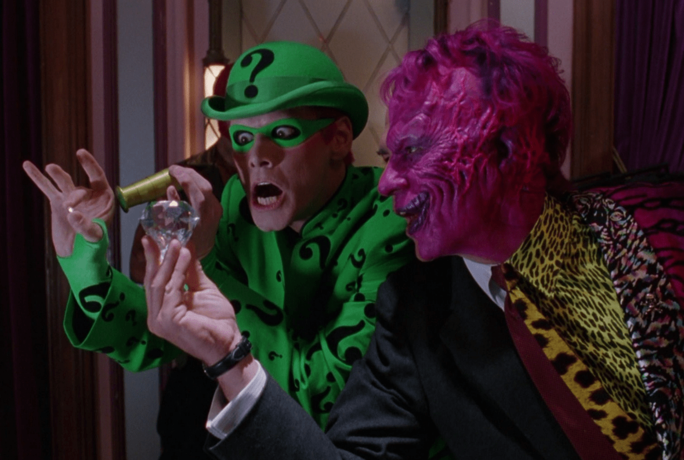 For the Riddler, the film hired Jim Carrey (fresh off Ace Ventura:Pet Detective, the Mask and Dumb & Dumber) and for Two Face? Tommy Lee Jones (their established actor choice-no doubt selected for his uncanny resemblance to Billy Dee Williams) was their choice.