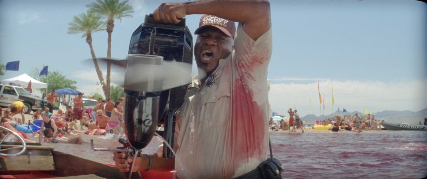 The reason is, the film does not take itself seriously. It is gleefully trashy and has fun with that. There is no message about ecology or anything. It is just about big and hungry fish. And people in swimsuits. The big sequence is a ridiculously over the top gore sequences as the Sheriff and Novak work alongside the deputies trying to save the Spring Breakers. The effects are largely very good (though some digital moments are pretty obvious) and the film is carnage candy.