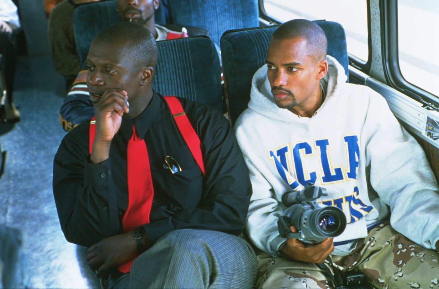 Get on the Bus follows several men on a chartered bus ride to attend the Million Man March. The passengers include Evans Sr. and his son “Smooth”, who are (due to a court order) chained together (Lee and writer Reggie Rock Bythewood were not being subtle there). There is Flip, an ego driven and boisterous actor. Xavier is an aspiring director making a documentary. Jamal and Randall are a gay couple whose relationship is at an impasse. And Pops is the sixties radical who seeks to inspire the young men around him.